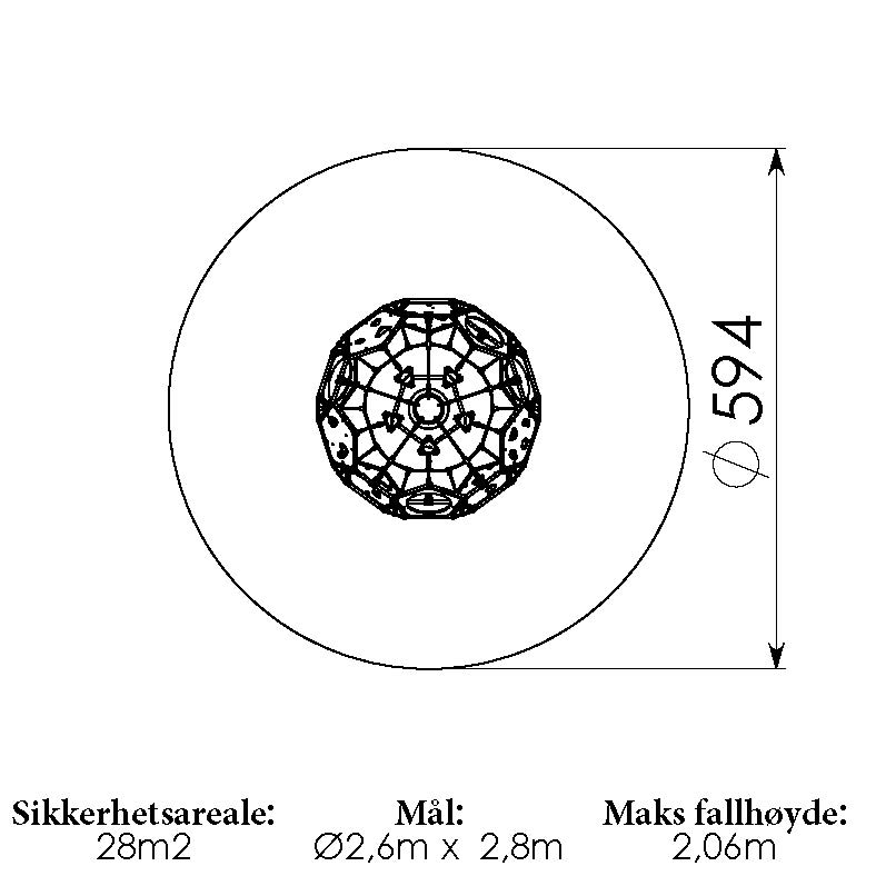 Mål: 2,6 x 2,8(B x H). Maks fallhøyde: 2,05 cm. Sikkerhetssone: 28 m2. For 15 barn fra 6 år. Garantier: HDPE plater har livstidsgaranti og pulverlakkert stål har 10 års garanti. PP belagt wire har 5 års garanti.