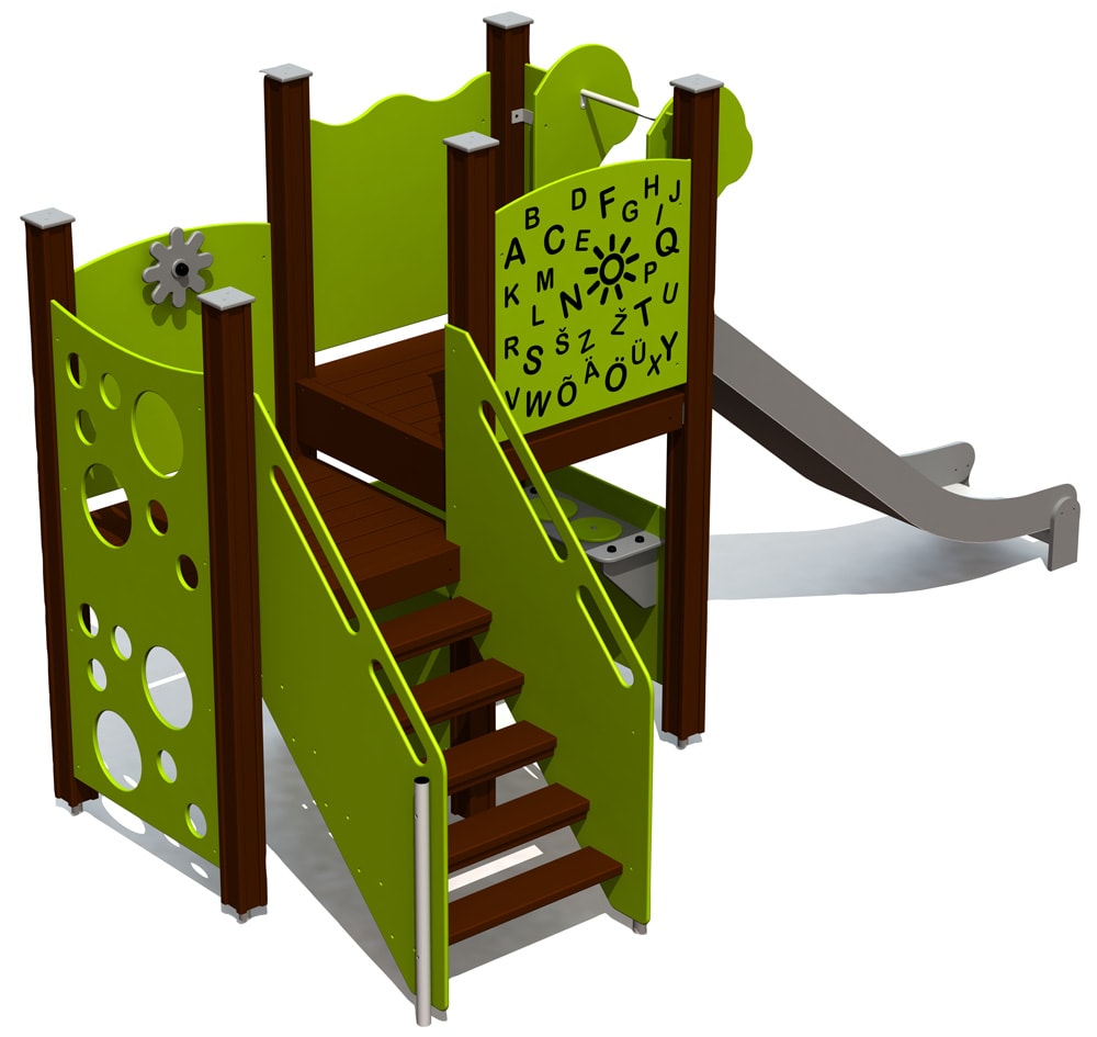 Leveres som standard med brune stolper i aluminium, brune plattformer, Veggplater i limegrønn samt detaljer i lys grått. Kan også leveres med grå eller gule stolper og andre fargevalg på plater hvis ønskelig.