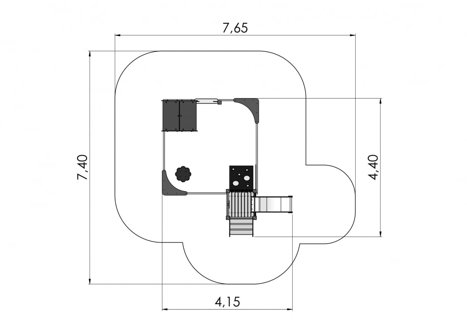 Lekeapparat for 4-8 barn fra 1 år. Maks fallhøyde: 0,95 m. Med stolper i aluminium, plater i HDPE, gulv i plastbelagt limtre. Pulverlakkerte ståldetaljer og sklie i HDPE.