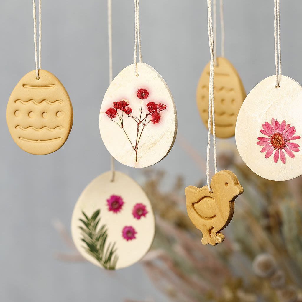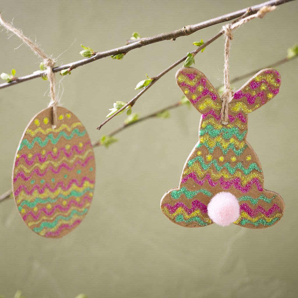 114 stk i esken. Håndlagede påskefigurer av pappmache med opphengssnor av lin . Leveres i praktisk borddisplay.